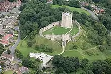 Le donjon comprend une tour circulaire centrale de 62 pieds de diamètre, avec six grands contreforts solides se projetant vers l'extérieur pour former un dessin hexagonal, unique en Angleterre[42]. Il est fait de calcaire magnésien de 28 mètres de hauteur[44]. Il comporte quatre étages : un rez-de-chaussée qui sert de sous-sol et de support voûté en pierre pour la chambre du dessus ; le premier étage, par lequel on accède au donjon ; deux étages supérieurs et un chemin de ronde, probablement couvert par un appentis et défendu par des créneaux[44].