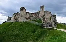 La cour intérieure ovale est formée en escarpant et contre-escarpant les contours naturels de la colline, produisant une berge, aujourd'hui en grande partie détruite, et un fossé de protection[34]. La courtine du début du XIIIe siècle est principalement constituée de pierres grossièrement taillées et assises, mesurant jusqu'à 7 pieds d'épaisseur et 35 pieds de haut, avec deux sections réparées avec des parements en Pierre de taille[35]. Le mur est défendu par six tours murales le long de ses côtés sud et ouest, dont trois sont encore raisonnablement intactes, et renforcées par des contreforts en pilastres le long du bord nord[35]. Une barbacane protège le lien entre le pont-levis et la guérite de la cour intérieure, complétée par une tourelle d'angle supplémentaire[36]. Les vestiges de l’effondrement de la courtine sont encore visibles dans le fossé[37].