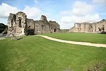 Le château de Conisbrough possède une cour extérieure et une cour intérieure d'environ 79 mètres sur 37[33]. On accédait au château par la cour extérieure, une enceinte rectangulaire protégée par des terrassements, qui aurait contenu les granges, les écuries et autres installations de service du château[34]. Un pont-levis du côté nord de la cour extérieure, désormais remplacé par une chaussée en terre, la reliait à la cour intérieure[34].