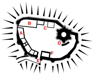 Les escaliers en béton actuels menant au donjon sont modernes et l'escalier médiéval d'origine, fait de bois et de pierre, aurait incorporé un pont-levis juste avant les portes du château[45]. Le sous-sol contenait un puits, accessible depuis le premier étage par un trou pratiqué dans le sol en pierre[46].