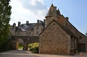 Ce logis s'appuie sur le donjon circulaire du XVe siècle, percé de fenêtres au XVIe siècle, sur lequel est venue s'accoler au XVIe siècle[14] une tourelle d'escalier en encorbellement, coiffé d'une couverture en croupe. Des éléments défensifs, il subsiste des embrasures de tirs dans la tourelle qui surveille la porte d'entrée ainsi que dans le donjon avec ses mâchicoulis, mais qui a perdu ses créneaux, datés tous les deux du XVe siècle[15], qui sont les parties les plus anciennes.