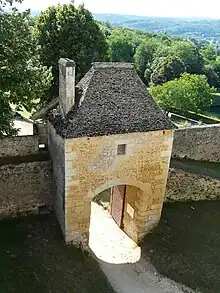 Une première enceinte s'ouvre à l'ouest par un châtelet d'entrée[7]. À l'est, un second châtelet, complètement à l'opposé du premier, permet de franchir la deuxième enceinte[8]. La lice entre les deux enceintes ne présente aucun abri éventuel pour des assaillants qui seraient parvenus à franchir la première enceinte. Le passage du premier châtelet vers le second ne pouvant s'effectuer que par la gauche, les assaillants sont obligés, dans leur progression, de présenter aux défenseurs leur côté droit, non protégé par le bouclier[9]. Les deux châtelets, pourvus de mâchicoulis, possèdent chacun une bretèche et une canonnière[7],[8].
