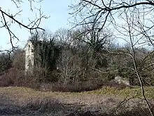 Vues depuis le sud-est, les ruines du château de Jovelle et de sa chapelle. | ||||