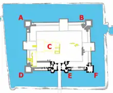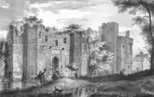 Le château du XVe siècle est de forme rectangulaire, de conception similaire au château de Farleigh Hungerford dans le Somerset ou au château de Baconsthorpe dans le Norfolk[33]. Bien qu'incomplets, les éléments subsistants et les fondations montrent qu'il a été conçu avec une tour carrée à chaque coin, avec des tours latérales moins importantes aux bords nord-est, sud-est et sud-ouest, et une grande guérite au nord-est[34]. Une rangée intérieure de bâtiments, de 17 pieds de profondeur, courait autour de l'intérieur du mur-rideau, légèrement en retrait du mur lui-même et formant une cour centrale[35].