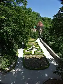 Au bas du château, un parc à l'anglaise aménagé au XIXe siècle couvre un espace de 125 hectares traversé par la Pełcznica (Hellebach en allemand). Une allée de tilleuls datant de 1725 mène au village voisin de Lubiechów/Liebichau, aujourd'hui intégré à la ville de Wałbrzych. On trouve également dans le parc la chapelle funéraire de la famille von Hochberg bâtie en style baroque.