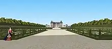 Restitution de la vue sur les parterres du château de Limours, depuis le premier étage, vers 1650.