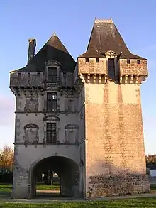 Les deux tours sont couronnées de créneaux et mâchicoulis et coiffées de hauts toits d'ardoises. Les fenêtres et une porte sont ornées de frontons sculptés.