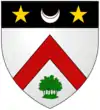 - Blason surmonté d'une mitre et d'une crosse d'abbé représentant 3 hachettes posées 2 et 1.