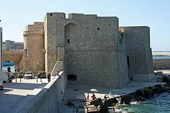- Le château se superpose à une grande porte romaine du Ier siècle av. J.-C. (qui surplombe l'armurerie), équipée de deux corps de garde à deux étages, surmontés de deux tours octogonales (actuellement presque entièrement incorporées aux masses du château du XVIe siècle. Les fortifications romaines sont fondées sur les puissants murs messapiens du Ve siècle av. J.-C. qui, à leur tour, dans l'abside de l'église, se dressent sur les restes d'une ancienne agger préhistorique.