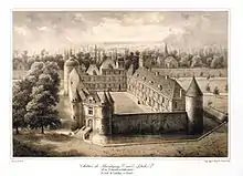 Le château Renaissance possède de grandes baies séparées par un ensemble de 44 colonnes jumelées doriques et ioniques[3] édifiées en 1550 sur une forteresse médiévale dont subsiste un vestige à l'angle occidental : la tour rouge. La façade méridionale qui donne sur un parc à l'anglaise a été remaniée au XIXe siècle[4]. La chapelle castrale, isolée maintenant, est un pur joyau Renaissance[3].
