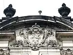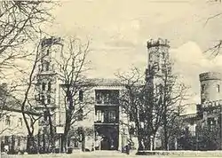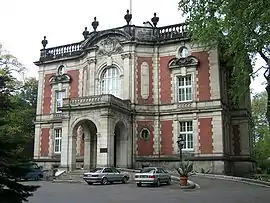 La partie centrale fut dotée d'un haut toit et d'une petite lanterne, surplombant ainsi les ailes nord et sud du château. Quatre toits plus élevés et des oriels furent rajoutés sur les côtés. Au sud et au nord de l'édifice, des pavillons d'un étage furent construits. En face de l'entrée ouest, une horloge et une clôture en fer forgé furent ajoutées pour les invités, clôture formant une place en forme d'arc en demi-cercle. Cette clôture était reliée par un imposant portail couronné de lions (aujourd'hui dans le zoo de Chorzów). Des balustrades furent érigées sur le côté est, à partir desquelles le lac était facilement accessible via des escaliers. Ces terrasses ainsi que les bassins et les sculptures sont les seuls éléments qui ont pu être conservés après la destruction du château en 1961. Ils permettent en effet de deviner la splendeur originelle du site. Les remarquables sculptures, représentant des luttes d'animaux, furent créées par le sculpteur français Emmanuel Frémiet[1].