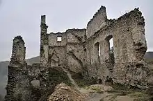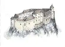 En 1458, le roi Mathias Corvin donne le château à la famille Podmanický qui le rénova la tour et le palais après le grand incendie de 1543. L'ensemble est érigé sur le lieu le plus élevé du rocher. Après l'occupation du château par l'armée de Thökölyi, l'empereur Léopold Ier le fit démolir en 1698.