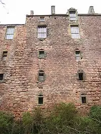 Les restes de l'entrée et de l'aile nord ne regroupent que des portions de murs et l'un des côtés de l'arche d'entrée, avec, en surplomb, les vestiges d'une échauguette. La courtine du XVe siècle s'élève toujours à une hauteur considérable le long de l'aile ouest du château. Cette section du mur a six ouvertures à sa base, l'une d'elles servant de poterne. Sur la façade extérieure, les six renfoncements étaient séparés par des contreforts arrondis. De vieux croquis de Roslin révèlent la présence d'échauguettes au-dessus de chaque contrefort et d'un chemin de ronde les reliant[8].