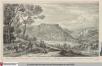 - Pendant la seconde conquête de la province par Louis XIV : Jacques Henri de Durfort se présenta le devant le château de Sainte-Anne commandé par Claude Baland, gendre du fameux Lacuzon, mais il n’avait sous ses ordres que 63 hommes dont la majorité était des paysans des environs. Il dut évacuer la place le ayant épuisé sa provision de poudre. Elle fut la toute dernière place forte comtoise à tomber et sa prise achève la conquête française de la Franche-Comté[8]. Le château fut totalement démantelé sur ordre de Louis XIV, en 1676.