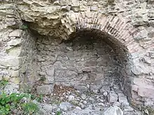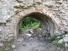 La porte médiévale se trouvait ainsi plus probablement sur l’enceinte ouest, directement au pied de la tour sud-ouest qui la couvrait. Bien que cette zone ait été grandement bouleversée par la construction de la casemate pendant la Première Guerre mondiale, une gravure du XIXe siècle et les quelques restes conservés permettent de voir que les fausses braies supportaient à cet emplacement un petit réduit fortifié ouvrant vers l’extérieur au nord et vers la cour du château à l’est[3].