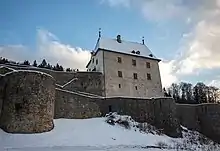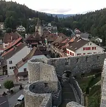Édifié sur un éperon rocheux surplombant le lit encaissé du Seyon, le château bénéficiait de défenses naturelles que l’on s’est contenté à cette époque d’accentuer par des ouvrages de maçonnerie. Au sommet de la butte, une première enceinte précède la tour-salle et correspond aux limites du réduit seigneurial. Des ouvertures de tir étroites ainsi qu’au moins une véritable archère équipaient la base de la tour et une partie de l’enceinte. En contrebas en direction du bourg, une basse-cour était entourée d’un mur particulièrement épais dominé par une solide tour quadrangulaire (la tour Prisonnière) depuis le milieu du XIVe siècle. Cette dernière semble avoir été bâtie dans un premier temps en avant de l'enceinte castrale pour contrôler et protéger le jeune bourg en contrebas, avant d'être englobée dans la muraille de la basse-cour (re)bâtie un peu plus tard. On accédait à cette dernière par un système de fossés secs et de portes à pont-levis assurant l’adextrement de l’assaillant[6],[5],[4].