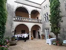 Haut logis quadrangulaire au sud-est du village sur un massif de maçonnerie légèrement taluté à sa base pour rattraper la pente de la colline. C'est un château de fin du XVe siècle, remanié à la Renaissance puis au XVIIIe siècle[22]. Il s'articule autour d'une cour d'honneur de 200 m2 environ, qui possède une galerie à double arcade surmontée d'une loggia à l'italienne[23].