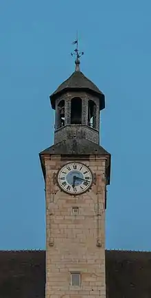 Elle est en plan carré, mesurant 4m de côté et domine tout l'édifice ; près de 25 mètres séparent le sommet de la corniche du niveau de l'esplanade. Cette tour fut construite dans le but de supporter une horloge, ainsi qu'en témoignent sa hauteur, son inutilité au point de vue défensif, la disposition intérieure du dernier étage et le petit escalier montant jusqu'au mécanisme de l'horloge actuelle, enfin et surtout, la présence sur la face est, de sculptures tracées évidemment pour entourer un cadran ; ces sculptures dessinent deux pieds-droits moulurés de cavets, agrémentés de bagues en larmier et supportés par des culs-de-lampe décorés de feuillages ; ils se terminent par des pinacles fleuronnés entre lesquels est compris un arc en tiers-point jadis décoré de crochets relevés vers le ciel ; Toute la partie médiane de l'ornementation qui comprenait deux contre-courbes rejoignant un fleuron central a été démolie pour l'installation du cadran, dont la véritable place est toute marquée sous l'arc en tiers-point.