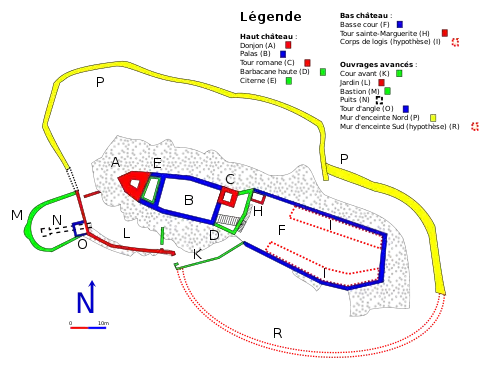 - XIIe – XIIIe siècle : donjon-bouclier pentagonal, logis seigneurial, tour romane, murs extérieurs du bas château, enceinte basse avec portail, puits souterrain ;