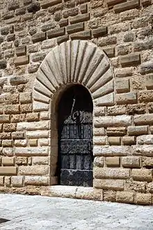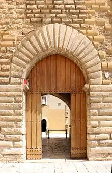 Les entrées sont diverses : la principale est constituée d'un grand portail situé du côté ouest, une seconde n'est guère plus qu'une porte du côté sud. Tous deux sont surmontés d'une couronne radiale en pierre de taille. Des mâchicoulis à deux tonneaux surplombent les entrées.