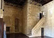 Depuis la porte principale, avec son arc en ogive, on entre dans la cour trapézoïdale, où se trouvent l'escalier menant à l'étage supérieur ainsi que les différentes pièces du rez-de-chaussée. L'escalier présente des bas-reliefs représentant des animaux et des scènes de chasse.