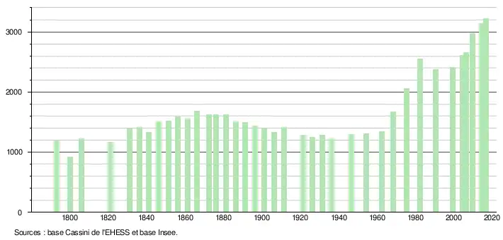L'évolution du nombre d'habitants est connue à travers les recensements de la population effectués dans la commune depuis 1793. Pour les communes de moins de 10 000 habitants, une enquête de recensement portant sur toute la population est réalisée tous les cinq ans, les populations légales des années intermédiaires étant quant à elles estimées par interpolation ou extrapolation[22]. Pour la commune, le premier recensement exhaustif entrant dans le cadre du nouveau dispositif a été réalisé en 2004[23].