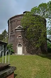 Le premier bâtiment, construit en 1904, est sur plan circulaire avec une capacité d'eau de 800 m3. Sans fenêtres, le château d'eau a une façade en briques rouge-brun. Le grand volume circulaire est caractérisé par un petit corps protubérant et surmonté d'un fronton de style néoclassique.