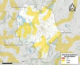 Le retrait-gonflement des sols argileux est susceptible d'engendrer des dommages importants aux bâtiments en cas d’alternance de périodes de sécheresse et de pluie. 37 % de la superficie communale est en aléa moyen ou fort (33,6 % au niveau départemental et 48,5 % au niveau national). Sur les 516 bâtiments dénombrés sur la commune en 2019, 105 sont en aléa moyen ou fort, soit 20 %, à comparer aux 25 % au niveau départemental et 54 % au niveau national. Une cartographie de l'exposition du territoire national au retrait gonflement des sols argileux est disponible sur le site du BRGM[18],[Carte 2].
