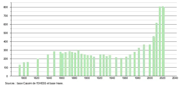 L'évolution du nombre d'habitants est connue à travers les recensements de la population effectués dans la commune depuis 1793. Pour les communes de moins de 10 000 habitants, une enquête de recensement portant sur toute la population est réalisée tous les cinq ans, les populations légales des années intermédiaires étant quant à elles estimées par interpolation ou extrapolation[11]. Pour la commune, le premier recensement exhaustif entrant dans le cadre du nouveau dispositif a été réalisé en 2005[12].