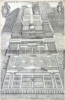 Les travaux se poursuivant avec l'aménagement des grottes avec leurs automates mus par des jets d'eau, dus aux frères Thomas et Alexandre Francini. Les parterres du jardin à la française, qui s'étalent jusqu'à la Seine sur cinq terrasses, ont été conçus par le paysagiste Étienne Dupérac et le jardinier Claude Mollet. Claude Mollet écrit dans son livre Théâtre des plans et jardinages qu'il a reçu l'ordre du roi de planter le jardin du château neuf en 1595[10]. Charles Normand indique avoir trouvé dans les archives nationales un contrat d'échange avec le seigneur de Bréhant daté du 1er septembre 1605 permettant au roi d'acquérir les terres et seigneuries du « Pec » et « Vézinay ». Par lettres patentes du 17 février 1623, le roi accorde à Tommaso Francini, sieur des Grands-Maisons (commune de Villepreux), « la charge d'intendant des eaux et fontaines des maisons, chasteaux et jardins de Paris, Saint-Germain-en-Laye, Fontainebleau et autres généralement quelconques, pour en jouir aux honneurs et pouvoirs y mentionnez, et aux gages de douze cens livres par an, pour y faire avec dix-huit cens livres dont il jouissait la somme de trois mil livres ». En 1625, Tommaso Francini est cité dans un acte comme ingénieur en artifice d'eaux reçoit « pour l'entretenement des grottes dud. chasteau de Sainct-Germain, la somme de douze cens livres ». En 1636, il reçoit 900 livres pour les grottes du château de Saint-Germain.