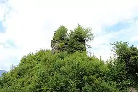 Les ruines de la tour apparaissent à droite dans la végétation. | |||