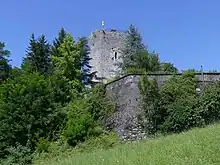 Au nord, subsiste partiellement, les murs du cellier. L'enceinte basse, s'appuyait sur les bords du Sierroz et s'étendait jusqu'au « prieuré ». L'enceinte haute, flanqué de tours rondes, épousait le sommet du plateau sur lequel le château est élevé. Entre les deux enceintes prenaient places les communs, fours, moulins et battoirs ainsi que le château Bausan, dont il ne reste traces et la chapelle dédiée à saint Pierre. C'est dans cette dernière que fut probablement enseveli à la fin du XVIe siècle, la femme de Guillaume de Portes, Jeanne d'Aragon. On peut y voir, des stèles ainsi qu'un sarcophage et plusieurs inscriptions romaines.