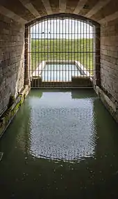 La voûte du bassin est faite de voussoirs en alternance de teinte. La façade extérieure, de même que les linteaux du niveau 1, est traitée en bossage rustique.