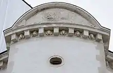 À la base de la toiture, une corniche à modillons alterne les têtes de chiens et les têtes de lions. Lors de la campagne photographique ayant suivi le classement du château comme monument historique en 1942, trois têtes de chiens au moins étaient encore en place ; ce décor a par la suite été recomposé sur les façades nord-est et nord-ouest[3]. À l'exception de cette décoration, qui évoque la chasse, les façades sont d'une grande sobriété qui tranche avec les usages de l'époque. Toutefois, leur élaboration est soignée et plus complexe qu'il n'y paraît, ce qui se note par plusieurs éléments : la gradation des matériaux — pierres rustiques pour le nymphée, pierres de taille lisses pour le soubassement, enduit à faux appareil et corniches saillantes des étages — ; le décrochement du socle du bâtiment pour suivre la pente du terrain, mettant en valeur le nymphée ; la variation des formes et des dimensions des baies intérieures et extérieures[4].