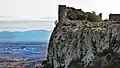 Vue des ruines du château au sommet du plateau, surplombant le village d'Opoul.