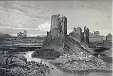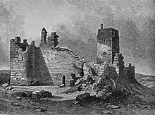 « [Du] pigeonnier on embrasse de biais tout l'ensemble du château. On voit, à droite, la façade dans laquelle se dessine la grande porte ogivale, en face de soi la tour ronde qui défendait l'angle gauche de cette façade ; à cette tour est une tourelle à pans coupés. Après avoir suivi la muraille à-demi écroulée, qui s'enfuit vers la gauche, l'œil aperçoit le donjon, haute tour carrée, sans toit, percé de nombreuses fenêtres. Tout cela est en ruines ; il ne reste pas un mur entier debout. Des corneilles innombrables, des chats-huants ont établi leur domicile dans le donjon que surmontait autrefois la bannière des Du Chastel. Mais ces ruines ont un aspect majestueux. Elles attestant de la grandeur de cette noble famille qui fut l'une des premières de Bretagne et dont deux des membres eurent l'honneur d'être inhumés à Saint-Denis, près des rois qu'ils avaient servis. »