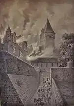 Vue générale sur la cour du château depuis la tour demi-ronde ; à gauche la Sainte-Chapelle, à droite l'aile du Midi.