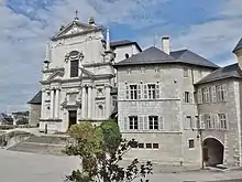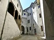 De l'intérieur de la cour intérieur : au centre les appartements privés, à droite les locaux abritant le conseil départemental de la Savoie, à gauche les locaux de la préfecture de Savoie.