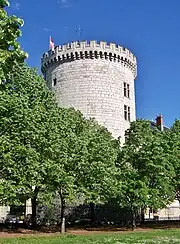 Construite dans la seconde moitié du XIVe siècle, de forme polygonale, en saillie sur la courtine nord, elle se compose d'une chambre basse garnie d'une double canonnière, de la première moitié du XVe siècle[13], aujourd'hui inaccessible car murée en 1726, légèrement voutée qu'éclaire une fenêtre grillagée et au-dessus la « salle haute », voûté avec de belles nervures, qui a contenu les archives des ducs avant que le trésorier général de Savoie en fasse ses bureaux en 1726. Au-dessus, une petite pièce qui s'éclaire, sur ses six pans, par une baie présentant un large ébrasement et la terrasse, ceinte d'un parapet percé de sept archères cruciformes.