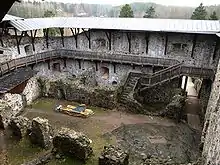 L'enceinte castrale est, avec la motte castrale, le premier château fort de l'histoire. Il semble même, d'après les recherches archéologiques récentes en Normandie, qu'elle serait antérieure à la motte (avant 1066). La fortification occupe souvent un terrain plat sur un éperon ou un promontoire. Une tour-porche en protège sommairement l'entrée. L'enceinte, précédée de douves ou de fossés, est constituée d'une palissade plantée ou non sur un terrassement (la terre est celle retirée du fossé). De forme ovoïde, cette clôture protège quelques bâtiments et abrite une mesnie[8] aristocratique, parfois une petite communauté paysanne (le terme de château est dans ce cas utilisé à tort).