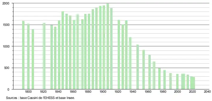 L'évolution du nombre d'habitants est connue à travers les recensements de la population effectués dans la commune depuis 1793. Pour les communes de moins de 10 000 habitants, une enquête de recensement portant sur toute la population est réalisée tous les cinq ans, les populations légales des années intermédiaires étant quant à elles estimées par interpolation ou extrapolation[23]. Pour la commune, le premier recensement exhaustif entrant dans le cadre du nouveau dispositif a été réalisé en 2008[24].