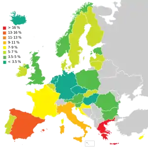 La crise de la dette des états européens les plus endettés éclate au même moment et conduit à des mesures de restrictions en Grèce, en Irlande, en Espagne, ou au Portugal. Il s’ensuit une récession pour ces pays accompagnée d'une hausse très forte du chômage. À la fin 2012 le taux de chômage atteignait quasiment 27 % en Espagne et en Grèce. Et début 2013, le taux de chômage atteint 12 % dans l'Union européenne[1].