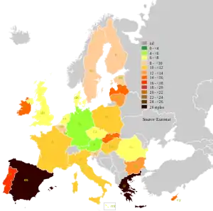 En , le taux de chômage des jeunes (moins de 25 ans) s’est établi à 21,4 % dans l’Union européenne et à 23,0 % dans la zone euro, contre respectivement 23,1 % et 23,9 % en . Il s’agit du taux le plus bas enregistré pour l’Union européenne depuis et pour la zone euro depuis . Les taux les plus bas en ont été observés en Allemagne (7,2 %), en Autriche (9,0 %) ainsi qu’aux Pays-Bas (9,6 %), et les plus élevés en Espagne (51,4 %), en Grèce (50,6 % en ), en Croatie (44,8 % au quatrième trimestre 2014) et en Italie (42,0%). La France se trouve légèrement au-dessus de la moyenne avec 25,2 %[2].