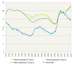 Le retour à une croissance même relativement incertaine a permis aux États-Unis d'enregistrer ensuite une décrue du chômage qui atteint désormais moins de 8 %[5]. Bien que souvent jugé limité ce recul fait ressortir par différence la dégradation de la situation dans l'Union européenne où sous l'effet d'une croissance atone et de mesures restrictives, le chômage continue de progresser, plusieurs pays connaissant un chômage de masse.