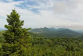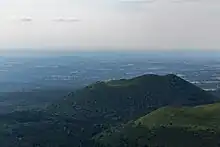 Au sud-ouest de cette chaîne de volcans datant du quaternaire, on aperçoit au loin un autre massif volcanique : la chaîne des monts Dore et les monts du Cantal qui datent, eux, de l'ère tertiaire.