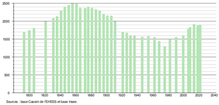 L'évolution du nombre d'habitants est connue à travers les recensements de la population effectués dans la commune depuis 1793. Pour les communes de moins de 10 000 habitants, une enquête de recensement portant sur toute la population est réalisée tous les cinq ans, les populations légales des années intermédiaires étant quant à elles estimées par interpolation ou extrapolation[19]. Pour la commune, le premier recensement exhaustif entrant dans le cadre du nouveau dispositif a été réalisé en 2008[20].