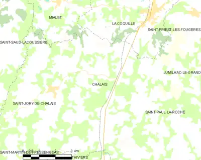 Chalais est une commune située dans le quart nord-est de la Dordogne, en Nontronnais. Elle est arrosée par le Touroulet, appelé ruisseau de la Pouyade dans sa partie amont.