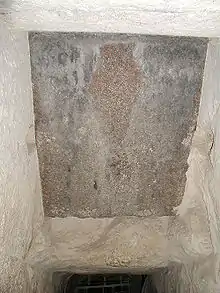 Les chevrons de l’entrée, doublés en hauteur, sont les premiers connus dans l’histoire de l’architecture. Ce sont des monolithes de calcaire qui, selon toute apparence, ne jouent ici qu’un rôle de décharge, comme ceux de la chambre du roi, et non vraiment de couverture, comme ceux de la chambre de la reine. Ils sont constitués d’éléments monolithes pesant chacun une dizaine de tonnes.