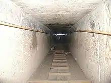 On remarque au fond du local, vers le sud, un couloir horizontal : il s’enfonce dans la roche sur seize mètres, puis s’interrompt brusquement car on en a arrêté le creusement et on a entamé la construction de la pyramide.