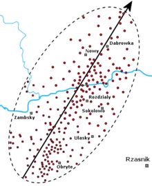 Dans le cas d'une fragmentation en plein ciel, les fragments les plus petits se déposent dans l'une des têtes de l'ellipse (la résistance de l'air diminuant leur vitesse horizontale plus rapidement), les fragments les plus volumineux, beaucoup moins freinés par le résistance de l'air, continuent leur route et se retrouvent sur l'autre tête de l'ellipse. L'observation du champ de dispersion, l'analyse de la dispersion des fragments et leur distribution en taille permettent d'estimer la direction et l'angle d'entrée dans l'atmosphère du météoroïde.